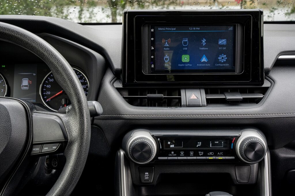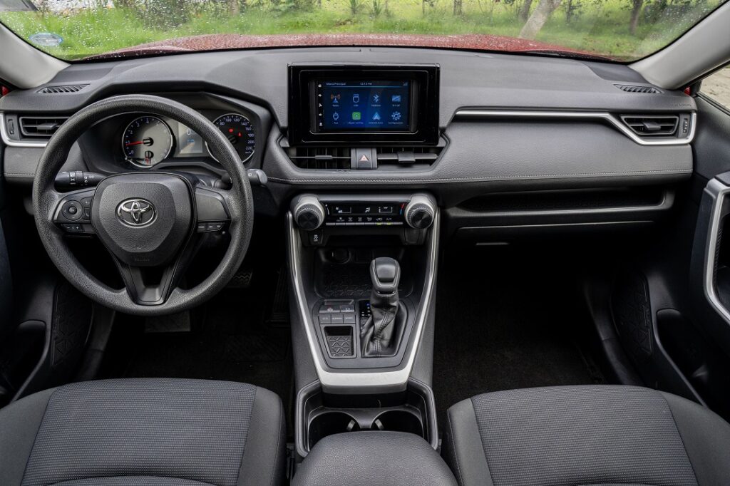 ayuda al manejo para mejorar el control del auto. Estos sistemas permiten mayor estabilidad en frenadas de emergencia y curvas, brindando confianza al conductor en situaciones críticas. Además, incluye un sistema de infoentretenimiento con una pantalla táctil de 8 pulgadas, Bluetooth y dos puertos USB ubicados en la consola central. Este sistema también es compatible con Apple CarPlay y Android Auto y se destaca por tener botones físicos alrededor de la pantalla que facilitan acciones como volver al menú principal u otras funciones, evitando que el conductor tenga que buscar en la pantalla táctil. Esto ayuda a mantener la vista en el camino al presionar directamente el botón necesario.